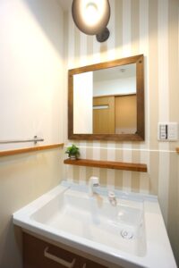 お洒落なパウダースペースがポイント!! 化粧台の交換、新しく鏡やライトなどの設置をして、 普通の洗面所が素敵な空間に生まれ変わりました