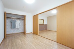 キッチンは対面式で料理しながら周りの様子が見えやすい!! お部屋の床はペットも快適に暮らせるペット向けフロアを使用してみました わんにゃんと暮らす方にぴったり♡ リビングは12帖 洋室の扉を全開にすればもっと開放的に! わんにゃんも走り回れちゃいます♪